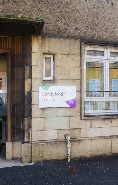 Main entrance: We share a building with the Health Clinic. The main entrance is on New Sneddon Street (across the road from Gilmour Street train station). There is Sandyford signage. We are located on the first floor via stair or lift access.